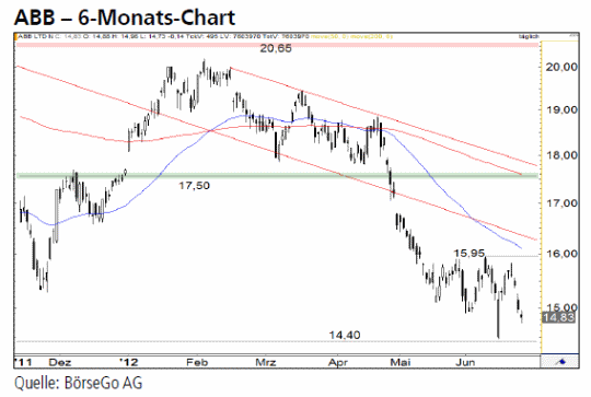 Ausblick: Der langfristige Abwärtstrend der Aktien von ABB ist weiterhin intakt und der misslungene Ausbruch aus der bullishen Flagge untermauert dies. Ein Rücksetzer unter 14,40 CHF würde für eine mittelfristige Fortsetzung dieser Baisse sprechen. Die Short-Szenarien: Sollte der Wert nachhaltig unter 14,40 CHF einbrechen, dürfte eine weitere Verkaufswelle bis 13,50 CHF und darunter bis auf 12,71 CHF zurückführen. Entsprechend könnte man einen Bruch der 14,40 CHF-Marke mit einem Shortengagegement handeln. Auf mittlere Sicht könnte sich der Abwärtstrend sogar bis zum Tief des Jahres 2008 bei 11,29 CHF ausdehnen. Die Long-Szenarien: Eine kurzzeitige Entspannung der Lage dürfte derzeit erst bei einem Anstieg über 15,30 CHF einsetzen und zu einer Erholung bis 15,95 CHF führen. An dieser Stelle könnte diese Gegenbewegung jedoch wieder enden und ein weiterer Abwärtsimpuls folgen. Sollte es den Käufern dagegen gelingen, den Widerstand bei 15,95 CHF zu überschreiten, wäre eine Ausweitung der Erholung bis zur langfristigen Abwärtstrendlinie auf Höhe von 16,50 CHF möglich.