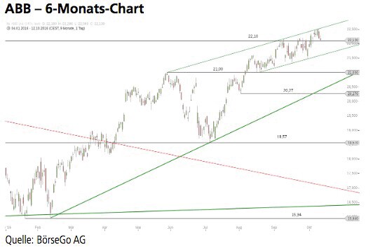Mit dem Überwinden der 22,10 CHF-Marke bietet sich ABB die Chance, die Rally auch mittelfristig noch weiter auszudehnen. Kurzfristig ist eine Konsolidierung möglich, welche nach dem mehrmonatigen Anstieg auch stärker ausfallen könnte. Die Long-Szenarien: Bereits ausgehend von der 22,10 CHF-Marke ist die Chance gegeben, den Anstieg wieder aufzunehmen. Die obere Trendbegrenzung bei derzeit 22,50 CHF dürfte in diesem Fall aber aufhalten und könnte einen weiteren Rückfall nach sich ziehen. Gelingt jedoch der Ausbruch über die 22,50 CHF-Marke, dann wird mittelfristig eine Beschleunigung der Bewegung möglich. In diesem Fall könnte eine grössere Aufwärtswelle bis zur 24,08 CHF-Marke führen, bevor an dieser langfristig wichtigen Barriere eine Zwischenkorrektur wahrscheinlich werden könnte. Die Short-Szenarien: Nach dem Scheitern an der oberen Begrenzung des Trendkanals der Vorwochen könnte dieser auch wieder vollständig durchlaufen werden, sodass ein Rückfall bis in den Bereich der 21,60 CHF-Marke möglich wäre. An dieser Unterstützung könnte die Aufwärtsbewegung erneut bestätigt werden. Fällt der Wert jedoch auch unter die 21,60 CHF-Marke, dürfte eine Zwischenkorrektur bis zur 21,00 CHF-Marke anstehen. Spätestens im Bereich des bei 20,50 CHF liegenden Aufwärtstrends könnte die Käuferseite anschliessend wieder im Vorteil sein.