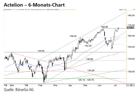 Rückblick: Nachdem sich die Aktien von Actelion unterhalb der 145,50 CHF-Marke lange seitwärts bewegten, gelang im April 2016 der Durchbruch durch diesen Widerstand.
