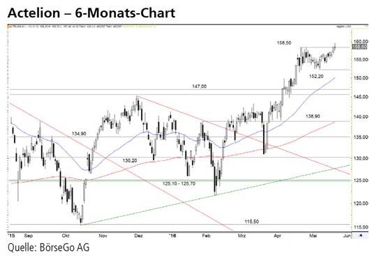 Rückblick: Seit Februar dieses Jahres geben die Bullen bei den Aktien von Actelion den Ton an und sorgten Mitte April mit dem Ausbruch über das bisherige Allzeithoch bei 147,00 CHF für ein mittelfristiges Kaufsignal.