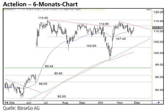 Ausblick: Die Aktien von Actelion stehen kurz vor einem weitreichenden Kaufsignal. Ein Ausbruch über das aktuelle Allzeithoch ist aus unserer Sicht wahrscheinlich. Die Long-Szenarien: Bei einem Überschreiten der kurzfristigen Hürde bei 112,80 CHF wäre die Flaggenformation überschritten und ein Angriff auf das Rekordhoch bei 115,50 CHF die Folge. Sollte der Wert anschliessend auch über die Barriere ausbrechen, könnte die Rally kurzfristig bis 122,00 CHF führen. Auf mittlere Sicht könnten die Aktien bei einem Anstieg über diese Marke bereits bis 126,00 und 132,00 CHF haussieren. Die Short-Szenarien: Sollte der Wert dagegen von der 112,80 CHF-Marke zurücksetzen, wäre eine weitere Korrektur bis an die Unterstützung bei 107,40 CHF zu erwarten. Auf diesem Niveau könnte sich ein bullishes Doppeltief ausbilden und sich der übergeordnete Aufwärtstrend anschliessend fortsetzen. Erst ein Ausverkauf unter diese Haltemarke würde den Wert stärker unter Druck setzen. Nach einem Kursrutsch an die 102,60 CHF-Marke dürften sich die Aktien von Actelion jedoch wieder nach Norden orientieren.