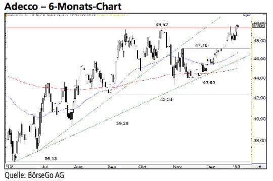 Kann die Käuferseite die Aktien von Adecco nachhaltig über der Barriere bei 49,52 CHF etablieren, wäre der Seitwärtsmarkt der letzten Jahre nach oben durchbrochen und ein mittelfristiges Kaufsignal aktiv. Die Long-Szenarien: Ein erfolgreicher Ausbruch über 49,52 CHF dürfte zunächst zu einer Kaufwelle bis 51,75 CHF führen. Nach einem bullish zu wertenden Rücklauf an die Ausbruchsmarke könnte sich die Rally bis 53,00 CHF fortsetzen. Ein Anstieg über diese Hürde dürfte weitere Käufer anlocken und zu einem Kaufimpuls bis an den mittelfristigen Widerstand bei 57,05 CHF führen. Die Short-Szenarien: Sollte der Wert dagegen unter 49,52 CHF zurücksetzen, könnte ausgehend von der Unterstützung bei 48,04 CHF ein weiterer Ausbruchsversuch erfolgen. Selbst eine Korrektur bis 47,16 CHF würde den bullishen Ausblick nicht gefährden. Erst ein deutlicher Bruch dieser Marke würde den Kaufimpuls seit Ende November neutralisieren und zu Abgaben bis zur Haltemarke bei 43,90 CHF führen. Sollte auf diesem Niveau eine Bodenbildung scheitern, dürfte es zu einem Ausverkauf bis 42,34 und darunter bis 39,29 CHF kommen.
