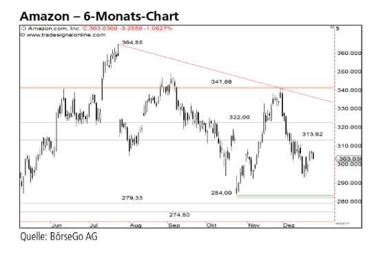 Ausblick: Die Aktien von Amazon haben ein weiteres Mal die Chance eine mittelfristige Trendwende einzuleiten. Hier - für muss allerdings der langfristige Unterstützungsbereich um 384,38 USD weiterhin verteidigt werden. Die Long-Szenarien: In der vergangenen Woche setzte eine erste Kaufwelle in Richtung des Widerstands bei 313,62 USD ein. Sollte diese Mar - ke jetzt durchbrochen werden, könnte eine Kaufwelle bis an die Hürde bei 322,00 USD führen.