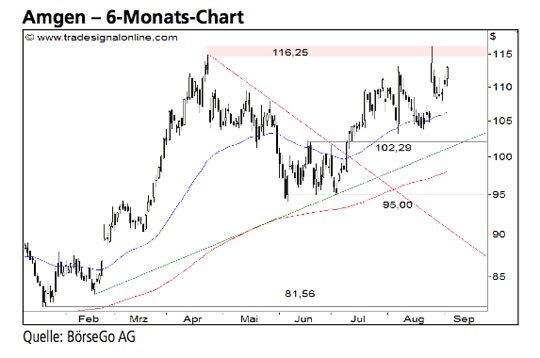 Der übergeordnete Aufwärtstrend des Wertes ist aus unserer Sicht uneingeschränkt intakt. Ein nachhaltiger Ausbruch über die aktuelle Rekordmarke würde entsprechend zu einer Fortsetzung der Rally führen. Die Long-Szenarien: Verbleibt der Wert oberhalb der kleinen Unterstützung bei 108,20 USD, dürfte es zu einem direkten Ausbruchsversuch über den Widerstandsbereich bei 116,25 USD kommen. Wird das Allzeithoch anschliessend durchbrochen, könnte die Rally kurzfristig bis 125,00 USD führen. Mittelfristig hätten die Aktien jedoch rechnerisch weiteres Aufwärtspotential bis 135,00 und 140,00 USD. Die Short-Szenarien: Ein Rücksetzer unter 108,20 USD würde dagegen zum Schluss des Aufwärtsgaps der vergangenen Woche und zu einer leichten Korrektur bis 102,29 USD führen. An dieser Stelle könnte sich der Aufwärtstrend bereits wieder fortsetzen. Fallen die Aktien von Amgen dagegen unter die Marke zurück, wäre ein kurzfristiges Verkaufssignal aktiviert. In der Folge dürfte ein Kursrutsch bis an die markante Unterstützung bei 95,00 USD führen. Hier dürfte sich ein Boden ausbilden.