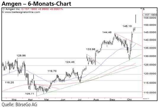 Mitte Mai entwickelte sich allerdings eine weitere dynamische Kaufwelle, die die Aktien schliesslich im August über die bisherige Rekordmarke ansteigen liess. In der Folge wurde der Wert von den Bullen in einem steilen Aufwärtsimpuls bis 144,46 USD gekauft. Im Anschluss an einen bullish zu wertenden Rücklauf an das vorherige Allzeithoch, setzte sich der Ansturm der Käuferseite in den letzten Tagen fort: In einer gewaltigen Aufwärtsbewegung zogen die Aktien von Amgen ausgehend von der 128,96 USD-Marke über die Barriere bei 144,46 USD an und erreichten zunächst den Rekordwert von 148,10 USD. Im gestrigen Handel sprang der Wert mit einem Aufwärtsgap über diese Marke und überschritt das in der KeyInvest Daily Markets Analyse vom 01.September anvisierte mittelfristige Kursziel bei 155,00 USD.