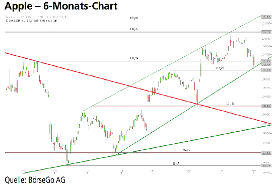 Nach einem Rekordhoch bei 134,54 USD kam es bei Apple bis August 2015 zu einem schnellen Kurseinbruch auf die 92,00 USD-Marke, bevor darüber eine Seitwärtsbewegung einsetzte.