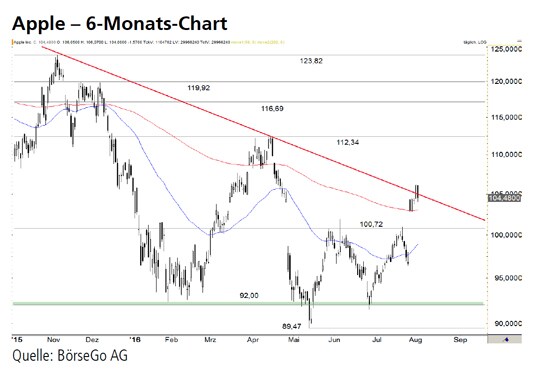 Rückblick: Die Aktien von Apple bewegten sich ab Mai 2015 abwärts. Es kam zur Ausbildung eines Abwärtstrends, allerdings entwickelte sich im Bereich der 92,00 USD-Marke eine wichtige Unterstützungszone.