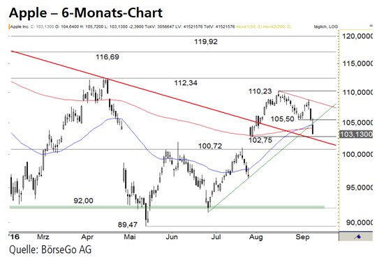 Ausblick: Der Bruch des Aufwärtstrends bei einem insgesamt schwächer werdenden Marktumfeld birgt die Gefahr einer umfassenden Korrektur. Auch die aus dem Juli noch offene Kurslücke könnte geschlossen werden. Allerdings bildet Apple auch einen Rücksetzer auf eine wichtige Kreuzunterstützung aus, sodass die Kaufsignale der Vorwochen jetzt bestätigt werden könnten. Die Long-Szenarien: Schafft Apple es, im Einzugsbereich der 102,75 USD-Marke und damit auch auf demgebrochenen Abwärtstrend wieder nach oben zu drehen, ist schnell eine Zwischenerholung bis zur 105,50 USD-Marke möglich. Über den bei 108,50 USD derzeit liegenden Abwärtstrend der Vorwochen müsste es hinausgehen, um ein Kaufsignal bis zur 110,23 USD-Marke zu generieren, was darüber hinaus einen Anstieg bis zur entscheidenden Kursmarke bei 112,34 USD ermöglichen könnte. Oberhalb der 112,34 USD-Marke würde sich eine Bodenbildung andeuten, welche die Chance auf einen Anstieg bis zur 119,92 USD-Marke bieten würde, mit einem Zwischenziel an der 116,69 USD-Marke. Die Short-Szenarien: Hält der Verkaufsdruck an und führt den Wert auch unter die 102,00 USD-Marke, wäre der Ausbruch der Vorwochen infrage gestellt. In diesem Fall wäre eine Verkaufswelle unter die 100,72 USD-Marke möglich, welche bis in den Bereich der 96,40 USD-Marke und mittelfristig noch einmal zur 92,00 USD-Marke führen kann.