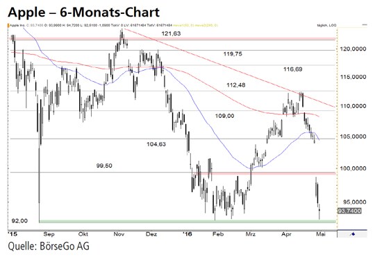 Rückblick: Noch im April vergangenen Jahres hatten die Aktien von Apple ein neues Allzeithoch bei 134,54 USD gebildet, ehe ein Trendwendeprozess einsetzte, der mit dem Bruch der Unterstützung bei 121,63 USD beendet und ein mittelfristiges Verkaufssignal generiert wurde.