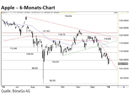 Ausblick: Die Verkaufswelle bei den Aktien von Apple nimmt bedrohliche Züge an. Es fehlt nicht mehr viel und der Wert könnte bis an das Vorjahrestief durchgereicht werden. Die Short-Szenarien: Sollte es den Bullen jetzt nicht gelingen, die Unterstützung bei 104,63 USD zurückzuerobern, käme es zu einem weiteren Einbruch bis an die Haltemarke bei 99,50 USD. An dieser Stelle hätte die Käuferseite erneut die Chance, eine kurzfristige Erholung zu beginnen. Wird die Marke dagegen im weiteren Verlauf unterschritten, wäre der Abwärtstrend seit Mitte Juli wieder aktiviert und ein Einbruch bis 92,00 USD die Folge. An dieser Stelle könnte sich allerdings ein tragfähiger Boden entwickeln. Die Long-Szenarien: Der seit Dezember laufende Abwärtsimpuls wäre aktuell dagegen erst bei einem nachhaltigen Anstieg über den Widerstand bei 109,00 USD unterbrochen. Damit wäre zugleich auch die kurzfristigen Abwärtstrendlinie überschritten und eine Aufwärtsbewegung bis 112,48 USD wahrscheinlich. Kann auch diese Hürde geknackt werden, stünde eine Ausweitung der Erholung bis 116,69 USD auf der Agenda.