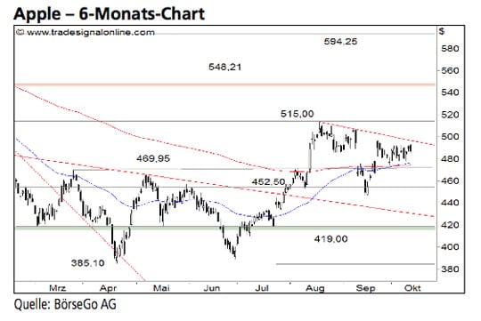 Der Doppelboden macht den Bullen Hoffnung auf höhere Kurse. Eine ehemalige Schlüsselunterstützung wurde aber bislang noch nicht zurückerobert. Dieses gilt es aus Sicht der Bullen in den kommenden Wochen nachzuholen. Die Long-Szenarien: Im Tageschart ist eine Abwärtstrendlinie bei rund 500,00 USD zu erkennen, die die Aktien in den kommenden Tagen überschreiten könnte. Dies würde einen frühen Hinweis auf ein Ende der seit August laufenden Konsolidierungsbewegung liefern. Den Schlüssel auf der Oberseite bildet allerdings die Widerstandszone zwischen 515,00 und 522,00 USD. Ein Anstieg darüber würde deutliches Kurspotenzial bis 594,25 USD eröffnen. Die Short-Szenarien: Kurse unter 470,00 USD sollten die Bullen indes vermeiden. Ansonsten dürfte die Unterstützung bei 452,50 USD angesteuert werden. Hält auch diese Marke nicht, drohen die Aktien von Apple bis auf 419,00 USD durchgereicht zu werden. Der mittelfristige Boden wäre in diesem Szenario stark gefährdet.