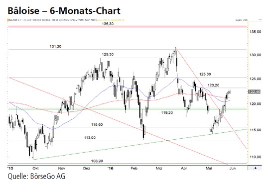 Rückblick: Seit beinahe zwei Jahren oszillieren die Aktien von Bâloise in einer breitangelegten Seitwärtsbewegung zwischen dem Widerstand bei 136,90 CHF und der mittelfristigen Unterstützungszone zwischen 108,90 und 113,00 CHF.