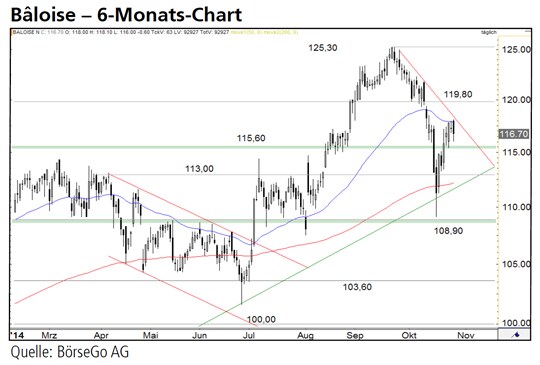Rückblick: Ausgehend vom Unterstützungsbereich um 103,60 CHF brachen die Aktien von Bâloise im Juni 2014 über die Oberseite einer bullishen Flaggenformation aus und überwanden bereits Mitte August das Verlaufshoch bei 115,60 CHF.