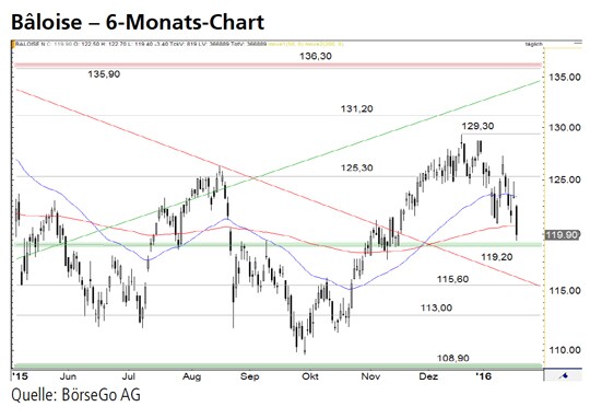 Ausblick: Die Gegenbewegung, die die Aktien von Bâloise in den letzten Wochen unter Druck setzte, könnte jetzt an dieser wichtigen Haltemarke enden. Die Chancen auf eine Fortsetzung des Aufwärtstrends sind trotz des gestrigen Rücksetzers weiter hoch. Die Long-Szenarien: An der 119,20 CHF-Marke sollten die Bullen jetzt das Ruder herumreissen und den Wert an die Hürde bei 125,30 CHF antreiben. Wird diese Barriere überschritten, wäre die Korrekturphase beendet und eine Kaufwelle bis an das Hoch des Dezembers bei 129,30 CHF wahrscheinlich. Dort dürfte es zu einer deutlichen Korrektur kommen. Gelingt den Bullen allerdings der Ausbruch über die Hürde, würde ein Aufwärtsimpuls direkt über die 131,20 CHFmarke führen und einen Angriff auf den Widerstandsbereich bei 135,90 CHF nach sich ziehen. Die Short-Szenarien: Setzt der Wert dagegen unter die Unterstützung bei 119,20 CHF auf Tagesschlusskursbasis zurück, würde sich die Gegenbewegung bis 115,60 CHF ausdehnen. Diese Haltemarke könnte von der Käuferseite für eine Fortsetzung des Aufwärtstrends als Startpunkt dienen. Erst bei einem Bruch dieser Marke wäre der Anstieg der letzten Monate beendet und in der Folge mit einem mittelfristigen Ausverkauf bis 108,90 CHF zu rechnen.