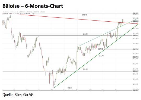 Davon ausgehend begaben sich die Notierungen im März 2015 in eine Korrektur, welche lange oberhalb der 109,10 CHF-Marke vollzogen werden konnte. Der Einbruch unter diese Unterstützung stellte sich im Juli dieses Jahres als Bärenfalle dar und wurde ausgehend von der bei 101,60 CHF liegenden Unterstützung wieder zum Kauf genutzt. Die daraufhin in den vergangenen Monaten absolvierte Rallybewegung verlief zunächst innerhalb einer bearishen Keilformation, wobei die Aktien jedoch relative Stärke gegenüber dem Gesamtmarkt bewiesen. Anfang Dezember gelang ein dynamischer Ausbruch aus der Keilformation nach oben, was einen Test des längerfristigen Abwärtstrends zur Folge hatte. Dieser wurde an den Vortagen überwunden.