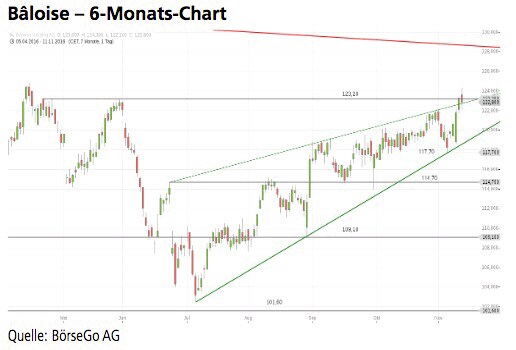 ... bei 101,60 CHF schon wieder Käufer fanden. Somit gelang den Notierungen in den vergangenen Monaten die Ausbildung eines Aufwärtstrends. Es bot sich darüber hinaus im Sommer unterhalb der 114,70 CHF-Marke die Ausbildung einer bullishen Trendwendeformation, welche Ende August dynamisch nach oben aufgelöst wurde. Der Kursverlauf entwickelte sich daraufhin zwar nur moderat aufwärts, zeigte aber gegenüber dem Gesamtmarkt relative Stärke. Die Entwicklung keilte sich seit Juli 2016 leicht bearish ein, der massgebende Aufwärtstrend konnte jedoch an der 117,70 CHF-Marke bestätigt werden. Bei stabilem Gesamtmarkt kam es zu einem Anstieg über die obere Trendbegrenzung der vergangenen Wochen hinaus.
