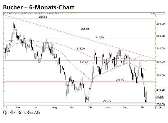 Rückblick: Der übergeordnete Abwärtstrend der Aktien von Bucher wurde im August vergangenen Jahres mit dem Bruch der wichtigen Unterstützung bei 230,60 CHF fortgesetzt.