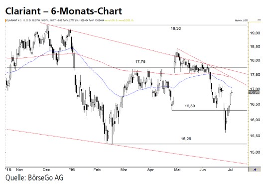 Ausblick: Eine bullishe Wochenumkehr oberhalb der Jahrestiefs kann günstige Voraussetzungen bieten, um eine grössere Bodenbildung einzuleiten. Die Widerstandszone im Bereich des intakten mittelfristigen Abwärtstrends begrenzt jedoch vorerst das Potenzial. Die Long-Szenarien: Auch bis zum steileren Abwärtstrend der vergangenen Wochen hätte Clariant noch Platz, sodass das Niveau um 17,50 CHF erreichbar wäre. Hier beginnt eine starke Widerstandszone, welche bis zur 18,00 CHF-Marke reicht und jederzeit einen Rücklauf nach sich ziehen kann. Kann die Käuferseite Clariant aber über die 18,00 CHF führen und damit auch den mittelfristigen Abwärtstrend nachhaltig überwinden, ist ein Kaufsignal möglich. Es würde sich die Chance bieten, weiter bis zur 19,30 CHF-Marke zu steigen. Oberhalb dieses Niveaus könnten die Aktien bis an die Hürde bei 21,45 CHF klettern. Die Short-Szenarien: Unterhalb der 17,50 CHF-Marke besteht die Gefahr, dass die laufende Erholung für Verkäufe genutzt wird. Sollte der Wert dabei auch unter die 16,30 CHF-Marke zurückfallen, könnte ein Einbruch bis zu den Jahrestiefs bei 15,26 CHF einsetzen. Mittelfristig müsste einkalkuliert werden, dass der Wert weiter an Boden verliert und somit auch die Unterstützung bei 14,70 CHF angesteuert werden könnte. Dieses Niveau könnte anschliessend eine günstige Gelegenheit für die Käuferseite darstellen.