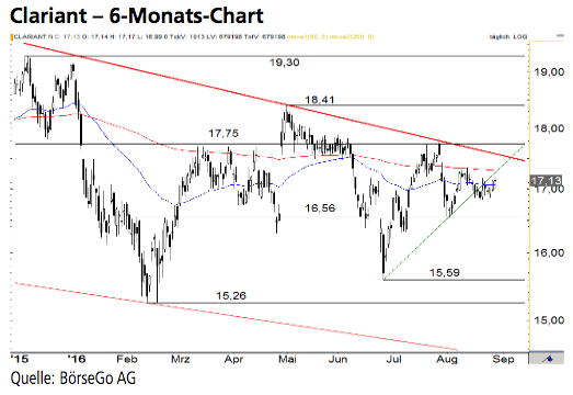 Der nach wie vor intakte Korrekturtrend könnte jederzeit stärkere Abgaben nach sich ziehen. Dies vor allem auch nach dem Rücklauf an den gebrochenen Aufwärtstrend der Vorjahre, sodass die Abwärtsbewegung auch neue mittelfristige Verlaufstiefs erreichen könnte. Dennoch stabilisieren sich die Notierungen auf dem kurzfristig erhöhten Niveau. Die Long-Szenarien: Die Aktien von Clariant bleiben im Einzugsbereich des mittelfristigen Abwärtstrends, sodass jederzeit ein weiterer Angriff auf diesen bei 17,50 CHF liegenden Widerstand starten könnte. Sollte ein Ausbruch gelingen, welcher auch über die 17,75 CHF-Marke führt, wird der Weg bis zur 18,41 CHF-Marke frei. Damit würde sich die Chance bieten, die seit April laufende Korrektur zu beenden und eine grössere Bodenbildung zu vollziehen. Oberhalb der 18,31 CHF-Marke wäre nämlich die Möglichkeit vorhanden, eine mittelfristige Kaufwelle bis 21,45 CHF-Marke zu durchlaufen, mit einem Zwischenziel an der 19,22 CHF-Marke. Die Short-Szenarien: Nach dem Bruch des mehrwöchigen Aufwärtstrends bietet sich die Möglichkeit, nochmals bis zur Unterstützung bis 16,56 CHF zu fallen. Abgaben unter dieses Kursniveau liessen das Chartbild bearisher werden und könnten eine Verkaufswelle bis zur 15,59 CHF-Marke nach sich ziehen. Dieses Niveau stellt auch mittelfristig eine wichtige Unterstützung dar, da darunter der Weg für den Wert bis zur Trendkanalunterkante bei 14,50 CHF führen könnte.