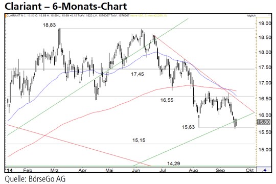 Dort beendete ein bearishes Doppelhoch im Juni 2014 den Ansturm der Käufer und die Aktien setzten bis an die Unterstützung bei 16,55 CHF zurück. Zwar kam es im Juli zu einer leichten Erholung, allerdings konnte der Wert nicht mehr an die Aufwärtsdynamik der Vormonate anknüpfen und scheiterte in seinen Erholungsbemühungen bereits an der Kurshürde bei 17,78 CHF. Dort setzte ein weiterer Verkaufsimpuls ein, der die Aktien von Clariant in einer steilen Abwärtsbewegung unter die Haltemarke bei 16,55 CHF einbrechen liess. In der Folge setzte der Wert an die langfristige Aufwärtstrendlinie auf Höhe von 15,60 CHF zurück, die Anfang August zunächst noch verteidigt wurde und eine Erholung bis 16,55 CHF auslöste. Allerdings scheiterten zwei darauffolgende Ausbruchsversuche der Bullen an dieser Marke und der Wert fiel nach der Ausbildung eines kurzfristigen bearishen Doppelhochs ein weiteres Mal deutlich zurück. Im gestrigen Handel wurde zudem die langfristige Aufwärtstrendlinie unterschritten und damit ein Verkaufssignal gebildet.