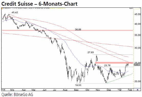 Ausblick: Die seit Ende Dezember entstandene Aufwärtsbewegung führte den Aktienkurs bis an die im Frühjahr 2011 etablierte Abwärtstrendlinie heran. Seitdem zieren sich die Aktien allerdings mit der Trendfortsetzung jener Aufwärtsbewegung und könnten unserer Einschätzung nach zunächst wieder nachgeben. Die Short-Szenarien: Sollten die Aktien in den kommenden Tagen unter das Niveau von 23,70 CHF zurückfallen, wären kurzfristige Rücksetzer bis in den Bereich von 22,00 CHF vorstellbar. Unterhalb davon müssten weitere Verluste bis 20,00 CHF und dem folgend bis zum September- Tief bei 19,53 CHF erwartet werden. Die Long-Szenarien: Ein Anstieg über 25,60 CHF könnte den Aktien andererseits weiteren Auftrieb bis 27,63 CHF verleihen. Oberhalb dieses Niveaus sollten weitere Käuferschichten das Interesse an diesem Wert entdecken und weitere Zugewinne bis 30,00 CHF erzeugen. Aus mittlerer Sicht könnten die Aktien im weiteren Verlauf den Widerstandsbereich von 36,88 CHF attackieren.