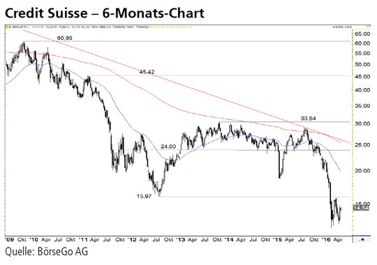 Rückblick: Die Aktien von Credit Suisse verloren seit August 2015 in einem starken Abwärtstrend in der Spitze mehr als die Hälfte ihres Börsenwertes.