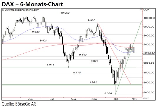 Rückblick: Die Mitte Oktober beim DAX Index begonnene Erholung setzte sich in den letzten Wochen mit dem Überschreiten der Widerstandsmarke bei 9.140 Punkten dynamisch fort.