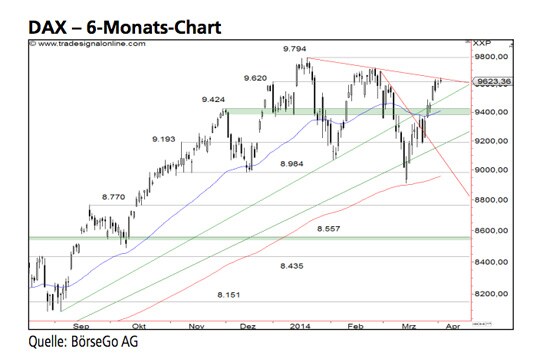 Ende März brach er im Rahmen einer Erholungsbewegung über eine Abwärtstrendlinie aus und überschritt nach einer leichten Korrekturphase den Widerstand bei 9.424 Punkten. Im Anschluss an dieses Kaufsignal zog der Wert weiter dynamisch an und erreichte in dieser Woche bereits die markante Kursbarriere bei 9.620 Punkten.