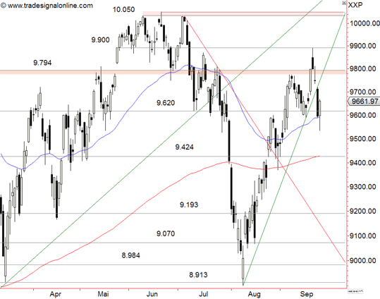 Der Kursrutsch der letzten Tage hat zum Bruch der steilen kurzfristigen Aufwärtstrendlinie geführt. Zusammen mit dem Unterschreiten der 9620 Punkte-Marke deutet dies auf den Beginn einer grösseren Korrektur hin.