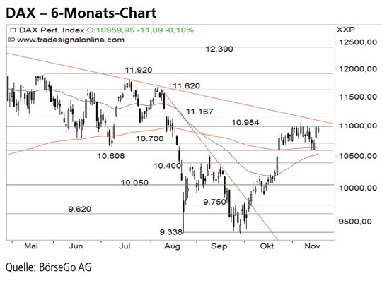 Ausblick: Das Momentum ist auf Seiten der Käufer. Die Chancen, das Widerstandsbollwerk um 11.000 Punkte aufzubrechen, stehen gut. Die Long-Szenarien: Im Fokus steht zunächst die Barriere bei 10.984 Punkten. Kann der DAX diese Hürde per Tagesschlusskurs hinter sich lassen, wäre ein erstes Kaufsignal aktiviert. In diesem Fall könnte sich der Index zügig in Richtung der Horizontalen bei 11.167 Punkten aufmachen. Etwas darüber gilt es für die Bullen noch eine Kurslücke im Chart zu schliessen. Dieses Gap im Chart wäre bei 11.278 Punkten wieder aufgefüllt. Über 11.278 Punkten wäre sogar viel Platz für die Käufer in Richtung 11.620 Punkte vorhanden. Die Short- Szenarien: Scheitert der DAX einmal mehr an der Barriere bei 10.984 Punkten und der psychologisch wichtigen Marke von 11.000 Punkten, dürfte er zunächst konsolidieren. Dabei befinden sich massgebliche Unterstützungen im Chart bei 10.700 und 10.608 Punkten. Beide Marken könnten Gegenbewegungen einleiten. Gibt der DAX dagegen die Unterstützung bei 10.600 Punkten auf, würde sich das Chartbild eintrüben. Verluste auf 10.400 Punkte werden dann wahrscheinlich.