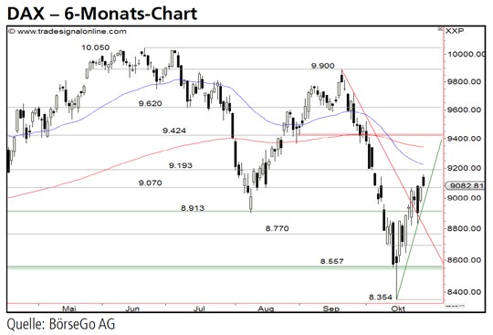 Hier wendete sich Mitte Oktober jedoch das Blatt zu Gunsten der Bullen, die den Wert direkt wieder über die 8.557 Punkte-Marke kauften und damit eine dynamische Erholung in Gang setzten. Diese führte den DAX direkt wieder an die Barriere bei 9.070 Punkten, die im gestrigen Handel mit einem Aufwärtsgap überschritten wurde.