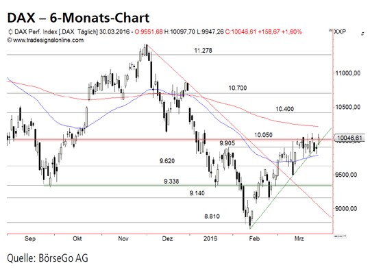 Rückblick: Mitte März war der DAX Index nach dem erstmaligen Erreichen der 10.050 Punkte-Marke nach unten abgeprallt und bis 9.500 Punkte gefallen.
