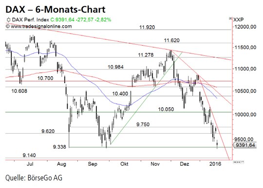 Ausblick: Es fehlt nur mehr ein charttechnischer Wimpernschlag und der DAX würde ein weitreichendes Verkaufssignal ausbilden. Die Chancen für die Bullen, eine Trendwende einzuleiten, schwinden zusehends. Die Short- Szenarien: Kurzfristig könnte es zwar bei einer Rückeroberung der 9.500 Punkte-Marke zu einem Anstieg bis 9.600 Punkte kommen. Dort wäre allerdings mit dem Start eines weiteren Ausverkaufs zu rechnen. Bricht der DAX in der Folge deutlich unter 9.338 Punkte ein, würde eine Verkaufswelle bis 9.140 Punkte einsetzen. Darunter würde die Unterstützung bei 9.030 Punkten angelaufen. Sollte diese Marke ebenfalls durchbrochen werden, droht ein Kursrutsch bis 8.803 Punkte. Die Long-Szenarien: Aufgrund der enormen Abwärtsdynamik der letzten Tage wäre aktuell erst ein Anstieg über 9.620 Punkte ein Zeichen für eine Entspannung der Lage. In diesem Fall könnte der Index bis an die Hürde bei 9.750 Punkten klettern. Doch erst ein Ausbruch über diese Marke würde eine Beschleunigung der Erholung bis 10.050 Punkte nach sich ziehen.