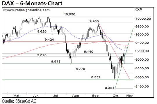 .. kam es in dieser Woche zu einem klassischen Rücklauf an das Ausbruchsniveau. Dazwischen hatte sich der Widerstand bei 9.340 Punkten in Form des EMA200 wiederholt als zu starke Hürde für die Bullen erwiesen. Ausgehend von 9.140 Punkten nimmt der DAX Index aber nun wieder Fahrt auf und hat gute Chancen, ein bedeutendes Kaufsignal zu generieren.