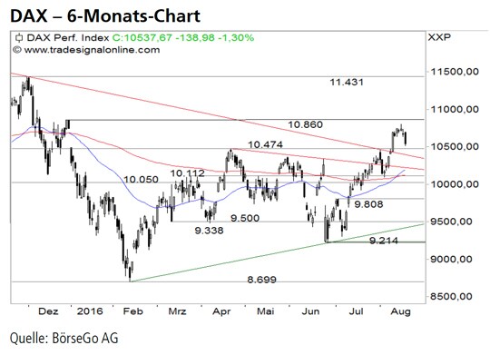 Ausblick: Die Konsolidierung ist bereits weit fortgeschritten, die unteren Ziele nahezu erreicht. Das Chance-Risiko-Verhältnis für neue Long-Positionen hat sich deutlich verbessert. Die Long-Szenarien: Kann der Index sich über dem gestrigen Tief bei 10.516 Punkten halten, könnte die Konsolidierung bereits beendet sein. Ein gutes Signal wäre es, wenn der DAX die Marke von 10.635 Punkten schnell wieder zurückerobert. Gelingt ihm im Anschluss auch der Ausbruch auf neue Zwischenhochs über 10.802 Punkte, wäre sofort der Widerstand bei 10.860 Punkten als nächstes Trendziel aktiviert. Reicht der Kaufimpuls darüber, könnte man mit Blick auf die kommenden Wochen ein Ziel bei 11.431 Punkten und damit das Hoch von Anfang Dezember 2015 ins Auge fassen. Die Short-Szenarien: Fällt der DAX dagegen unter 10.516 Punkte zurück, dürfte der Index einen weiteren Umweg über die massive Unterstützungszone bei 10.470 Punkten nehmen. Dort stoppt die Konsolidierungswelle im Idealfall und ein neuer Aufwärtsimpuls sollte starten. Bleibt eine Stabilisierung dagegen aus, könnte sich die Verschnaufpause in Richtung der nächsten Unterstützung bei 10.370 Punkten ausdehnen.