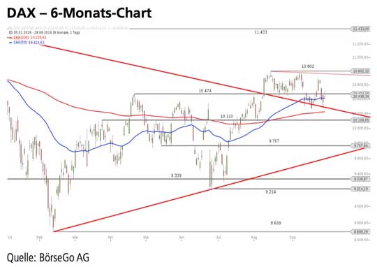 Der DAX Index brach in den vergangenen Wochen aus dem mittelfristigen Abwärtstrend nach oben aus, schaffte anschliessend jedoch nur einen kurzfristigen Anstieg bis zur 10.802 Punkte-Marke.