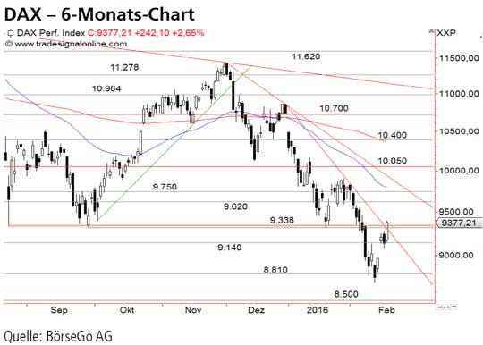Anfang Februar wurde der DAX Index von einer weiteren Verkaufswelle erfasst und unter die wichtige Unterstützung bei 9338 Punkten ausverkauft.