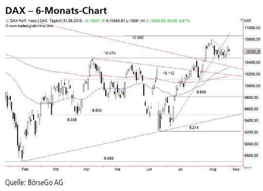 Rückblick: Der DAX Index befindet sich seit Ende Juni ausgehend von der 9.214 Punkte-Marke in einer Aufwärtsbewegung, welche aus dem mittelfristigen Abwärtstrend herausgeführt hat.