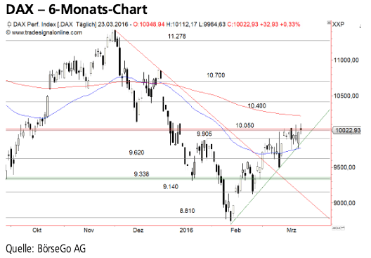 In den letzten Wochen stieg der DAX Index in einer dynamischen Aufwärtsbewegung in Richtung der 10.000 Punkte-Marke an und überwand dabei in der vergangenen Woche die Hürde bei 9.905 Punkten. In der Folge kletterte der Index Schritt für Schritt an den Widerstand bei 10.050 Punkten.