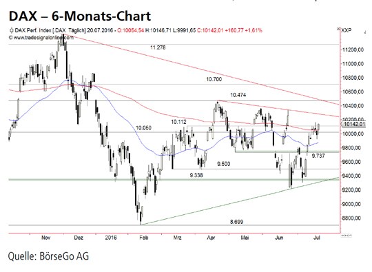 Rückblick: Der Ausverkauf nach dem Brexit-Referendum wurde im DAX Index im Einzugsbereich der Unterstützung bei 9.338 Punkten gestoppt.