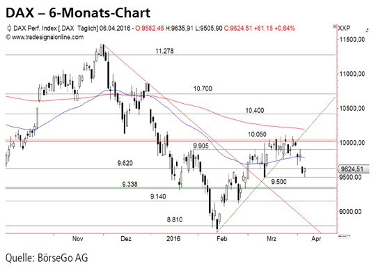 Ausblick: Der Kursrutsch der Vorwoche legt aus unserer Sicht den Schluss nahe, dass der DAX aktuell die gesamte Erholung seit dem Tief bei 8.699 Punkten korrigiert. Damit ist weiteres Abwärtspotenzial vorhanden. Die Short-Szenarien: Bricht der Index in den kommenden Tagen auch unter die 9.500 Punkte- Marke ein, wäre ein weiteres Verkaufssignal aktiviert und ein Ausverkauf bis an die Haltemarke bei 9.338 Punkten zu erwarten. Der DAX hätte sich dem Tief des Februar damit bereits bedrohlich genähert, könnte dort jedoch eine kurzzeitige Erholung starten. Sollte die 9.338 Punkte-Marke anschliessend jedoch ein weiteres Mal unterschritten werden, käme es zu einer Verkaufswelle bis an die 9.140 Punkte-Marke. Kann auch diese Unterstützung dem Ansturm der Bären nicht standhalten, droht der tiefe Rückfall auf die 8.810 Punkte-Marke und das Jahrestief bei 8.699 Punkten. Die Long-Szenarien: Eine Rückeroberung der 9.620 Punkte-Marke würde die Situation dagegen nur kurzzeitig entlasten. In diesem Fall könnte es zu einem Anstieg bis 9.750 Punkte kommen. Der Widerstand sollte die Erholung jedoch abbremsen und für die Bären zum Startpunkt einer weiteren Abwärtsbewegung werden. Erst über der Hürde käme es zu einer deutlicheren Gegenbewegung.