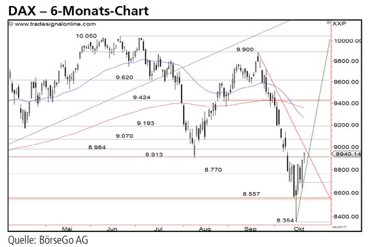 Rückblick: Der Ende September einsetzende, massive Abwärtstrend beim DAX Index sorgte Anfang Oktober für den Bruch der Unterstützung bei 8.913 Punkten.