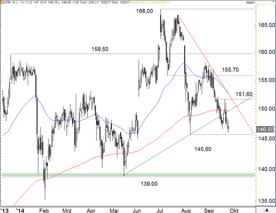 Der zukünftige Verlauf der Aktien von Dufry hängt entscheidend davon ab, ob es den Bullen gelingt, auf dem aktuellen Niveau einen Boden auszubilden.