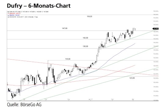 Rückblick: Mit dem Ausbruch über eine mittelfristige Abwärtstrendlinie und den darauffolgenden Anstieg über den Widerstand bei 130,90 CHF generierten die Aktien von Dufry ein wichtiges Kaufsignal, das den vorherigen Seitwärtsmarkt im Januar beendete.