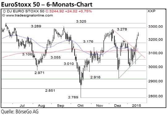Ausblick: Nach dem aktivierten Kaufsignal auf der Tagesebene steht der Index auch im mittelfristigen Bild unmittelbar vor einem positiven technischen Signal. Hierfür muss er allerdings noch eine Abwärtstrendlinie überwinden. Die Long-Szenarien: Der Abwärtstrend lässt sich über die Hochpunkte der im Juni 2014 gestarteten Konsolidierungsbewegung einzeichnen und verläuft aktuell bei knapp 3.270 Punkten. Etwas darüber befindet sich im Chart auch das letzte markante Hoch bei 3.278 Punkten. Sollte die laufende Aufwärtsbewegung direkt über diese beiden Widerstände weiterlaufen, wären die Bullen in einer exzellenten Ausgangsposition, den Index wieder in Richtung des Jahreshochs 2014 bei 3.325 Punkten zu befördern. Die Short-Szenarien: Ein Umweg auf der Unterseite über die Unterstützung bei 3.176 Punkten würde das kurzfristig positive Chartbild noch nicht eintrüben. Erst wenn der Eurostoxx 50 unter 3.106 Punkte und damit wieder in das Dreieck zurückfiele, wäre das Ausbruchsszenario negiert und Verluste bis auf die Unterstützung bei 3.055 Punkten die wahrscheinlichste Variante für die darauffolgenden Tage.