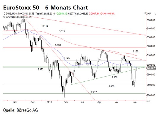 Ausblick: Die Dynamik der begonnenen Erholung spricht für ein hohes Kaufinteresse, was weiter steigende Notierungen nach sich ziehen könnte. Derzeit besteht aber noch die Gefahr, einen bearishen Rücklauf auszubilden. Die Long-Szenarien: Sollte der Kaufdruck anhalten und der EuroStoxx 50 sich auch über die bei 2.973 Punkten liegende Unterstützung zurückbewegen, ist ein Anstieg zur 3.045 Punkte-Marke möglich. Der Ausbruch über den dort liegenden Abwärtstrend könnte Spielraum bis zur 3.156 Punkte-Marke schaffen. Die Short- Szenarien: Ein Scheitern am Bereich der Widerstandszone bei 2.973 Punkten würde hingegen für eine Bestätigung des Aufwärtstrendbruchs sprechen. Abgabedruck in Richtung der 2.850 Punkte-Marke, aber auch direkt zu den Tiefs bei 2.800 Punkten, kann in diesem Fall aufkommen. Es muss auch einkalkuliert werden, dass in diesem Fall ein grösserer Abwärtsimpuls bis zum Tief des Februars bei 2.673 Punkten starten könnte. Angesichts der in dieser Woche noch anstehenden Brexit-Entscheidungen, dürfte der EuroStoxx 50 weiter erhöhte Volatilität aufweisen.