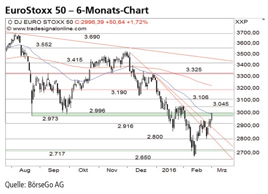Ausblick: Die in der letztwöchigen KeyInvest Daily Markets Analyse erwähnte mittelfristige Abwärtstrendlinie ist überschritten. Damit ist die schlimmste Gefahr im EuroStoxx 50 erst einmal gebannt. Die Lage scheint sich zu entspannen. Die Long-Szenarien: Einen Boden auszurufen, wäre dennoch verfrüht. Hierfür bedarf es weiterer Kursgewinne. Im Fokus steht kurzfristig die Widerstandszone um 2.996 Punkte. Wird auch sie zur Oberseite verlassen, dürfte der Index die letzten markanten Zwischenhochs um 3.045 Punkte in Angriff nehmen. Ein Anstieg darüber würde einer mittelfristigen Trendwende gleichkommen. Der EuroStoxx 50 könnte sich dann auf 3.045 Punkte und im Anschluss auch 3.106 Punkte erholen. Auf Sicht mehrerer Wochen wären sogar Kurse um 3.325 Punkte vorstellbar. Die Short-Szenarien: Prallt der EuroStoxx 50 dagegen am Widerstand bei 2.996 Punkten nach unten ab, dürfte er bis zur Unterstützung bei 2.916 Punkten konsolidieren, um im Anschluss erneut Anlauf in Richtung der Marke von 3.000 Punkten zu nehmen. Unter 2.916 Punkten deutet sich ein grösserer Rücksetzer auf 2.800 Punkte an. Sollte auch diese Marke fallen, wäre die Bodenbildung erst einmal gescheitert.