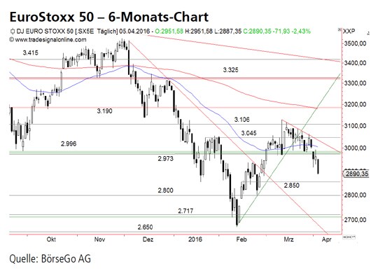 Rückblick: Nachdem der EuroStoxx 50 Index Mitte März die Kurshürde bei 3.106 Punkten erreicht hatte, begann der Wert eine dreiecksförmige Korrektur, die ihn mehrfach an die Unterstützung bei 2.973 Punkten zurückführte.
