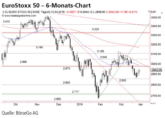 Rückblick: Mit einem Verlaufshoch bei 3.128 Punkten endete Mitte März die mehrwöchige Erholung beim EuroStoxx 50 Index.