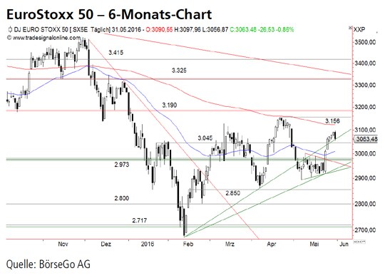 Rückblick: Dem Verlaufshoch von Mitte April folgte beim EuroStoxx 50 Index ein heftiger Kursrutsch, der im Mai in eine breitangelegte Seitwärtsphase oberhalb der 2.900 Punkte- Marke überging.